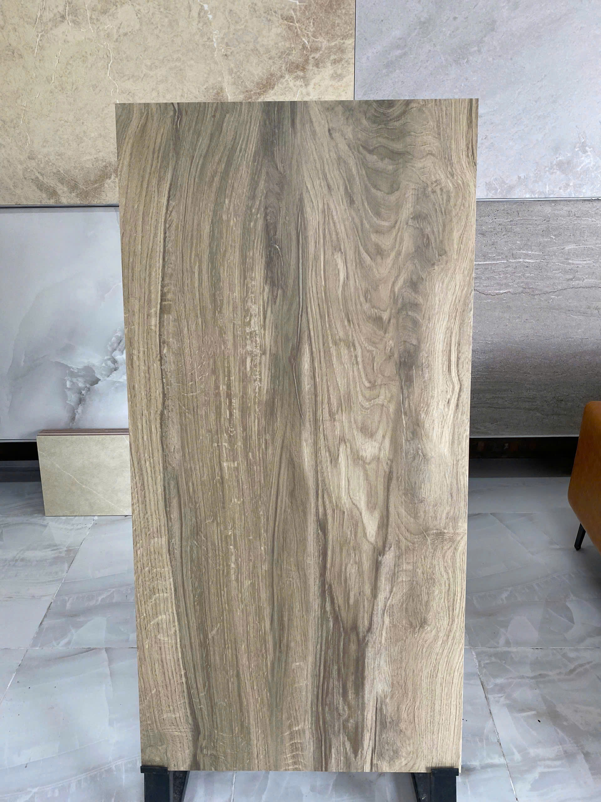 Vân gỗ chân thực: Bề mặt gạch mô phỏng gỗ tự nhiên, từng đường vân, sắc độ sống động.