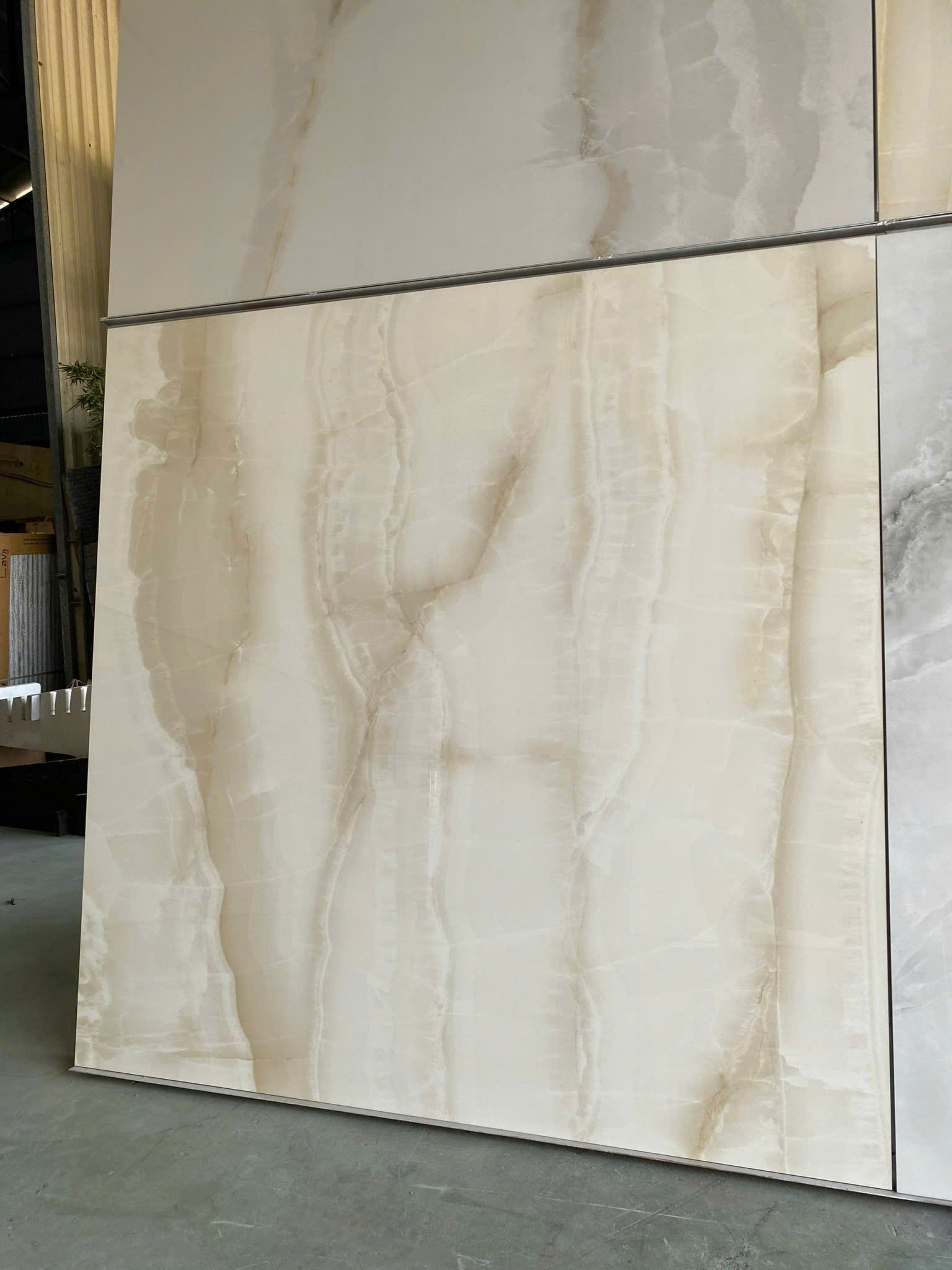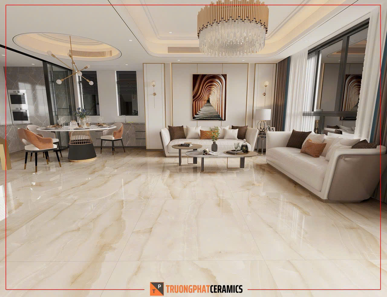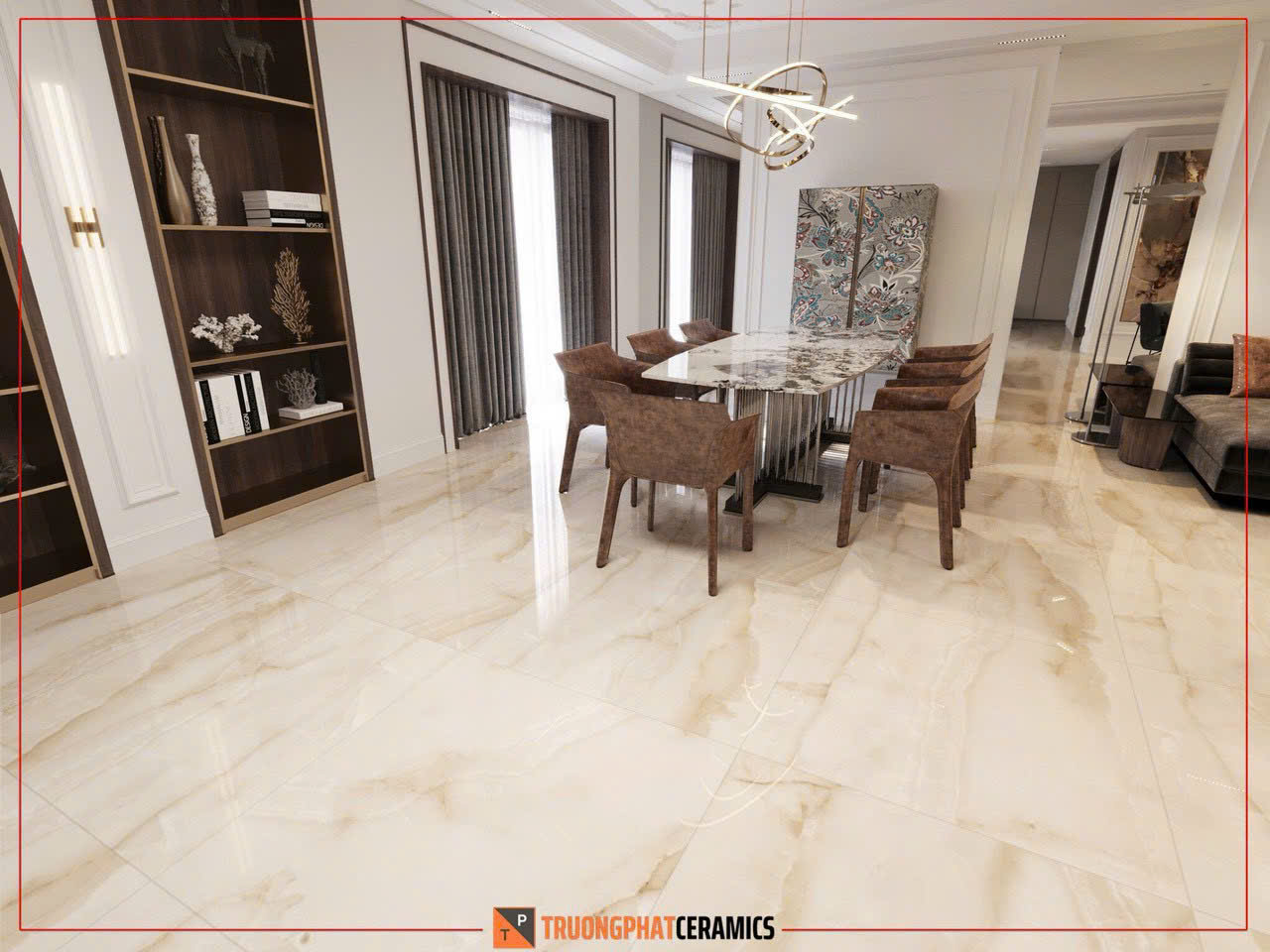 Bề mặt: Men bóng hoặc bán bóng, với họa tiết vân đá Onyx tự nhiên, màu sắc Ivory (màu ngà) trang nhã.