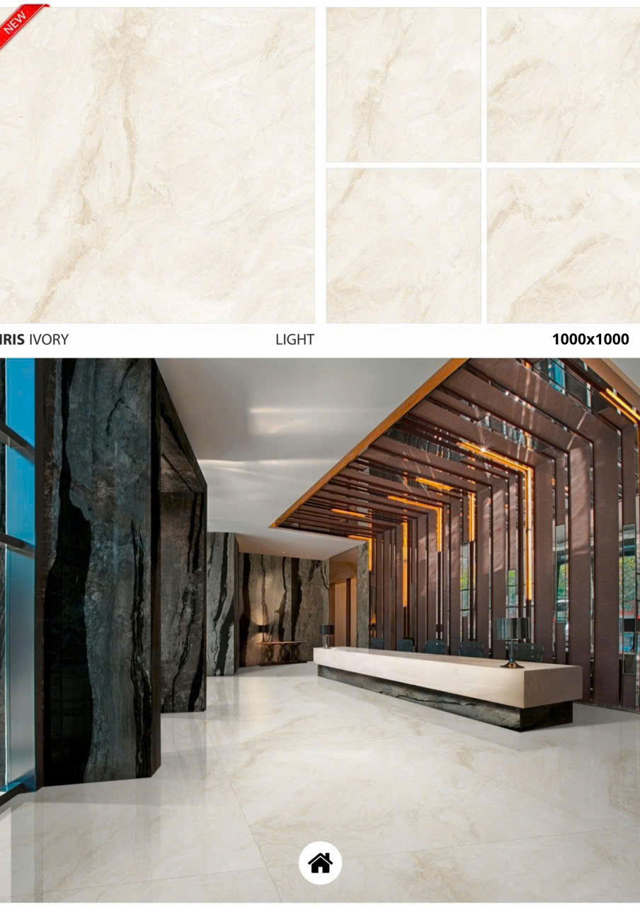 Gạch nhập khẩu Ấn Độ 1mx1m Iris Ivory là một loại gạch ốp lát cao cấp được nhập khẩu từ Ấn Độ, có kích thước lớn 100x100cm và màu sắc kem ngà (ivory) sang trọng. Dưới đây là một số thông tin chi tiết về loại gạch này: